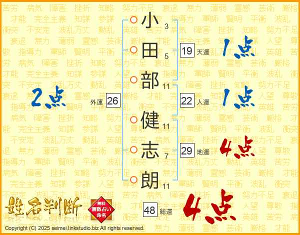 小(3画)田(5画)部(11画) 健(11画)志(7画)朗(11画)