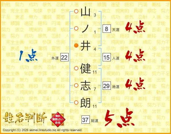 山(3画)ノ(1画)井(4画) 健(11画)志(7画)朗(11画)