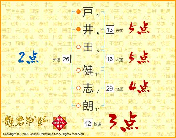 戸(4画)井(4画)田(5画) 健(11画)志(7画)朗(11画)