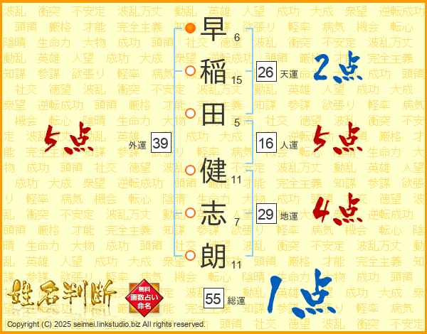 早(6画)稲(15画)田(5画) 健(11画)志(7画)朗(11画)