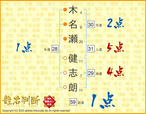 木(4画)名(6画)瀬(20画) 健(11画)志(7画)朗(11画)