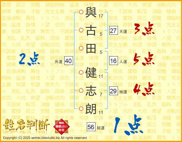 與(17画)古(5画)田(5画) 健(11画)志(7画)朗(11画)