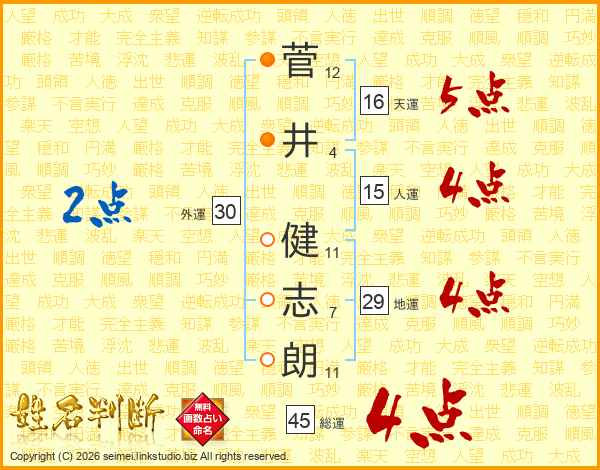 菅(12画)井(4画) 健(11画)志(7画)朗(11画)
