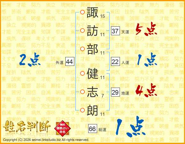 諏(15画)訪(11画)部(11画) 健(11画)志(7画)朗(11画)