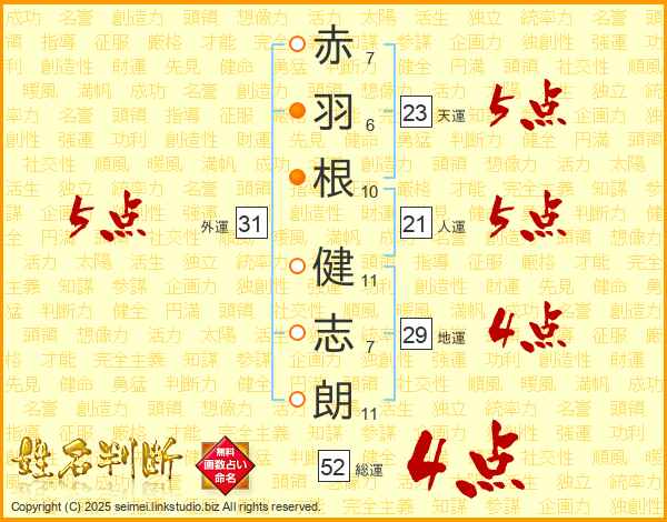 赤(7画)羽(6画)根(10画) 健(11画)志(7画)朗(11画)