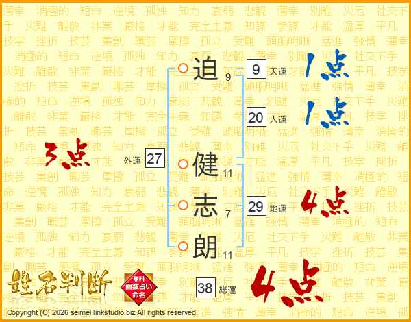 迫(9画) 健(11画)志(7画)朗(11画)