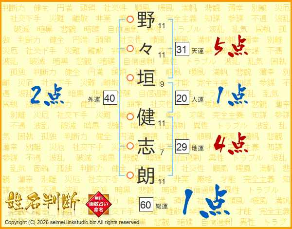 野(11画)々(11画)垣(9画) 健(11画)志(7画)朗(11画)