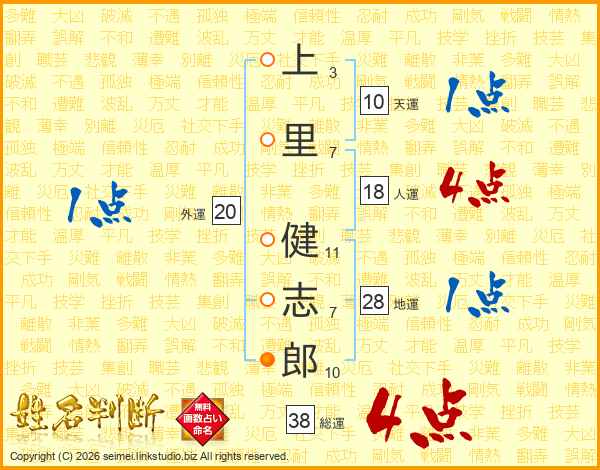 上(3画)里(7画) 健(11画)志(7画)郎(10画)