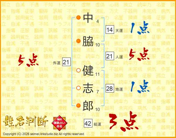 中(4画)脇(10画) 健(11画)志(7画)郎(10画)