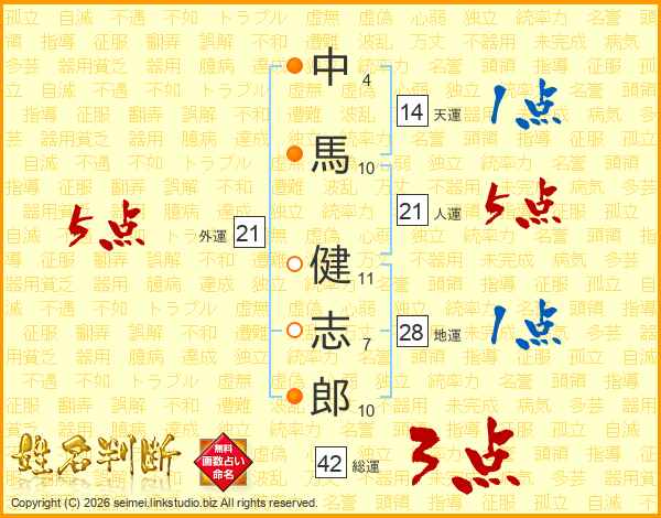 中(4画)馬(10画) 健(11画)志(7画)郎(10画)