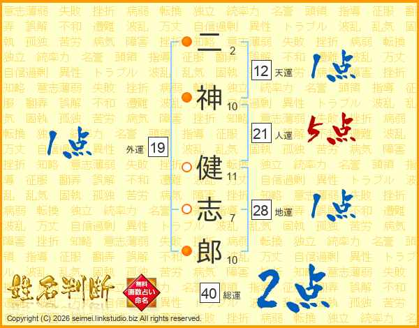 二(2画)神(10画) 健(11画)志(7画)郎(10画)