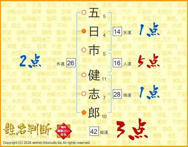 五(5画)日(4画)市(5画) 健(11画)志(7画)郎(10画)