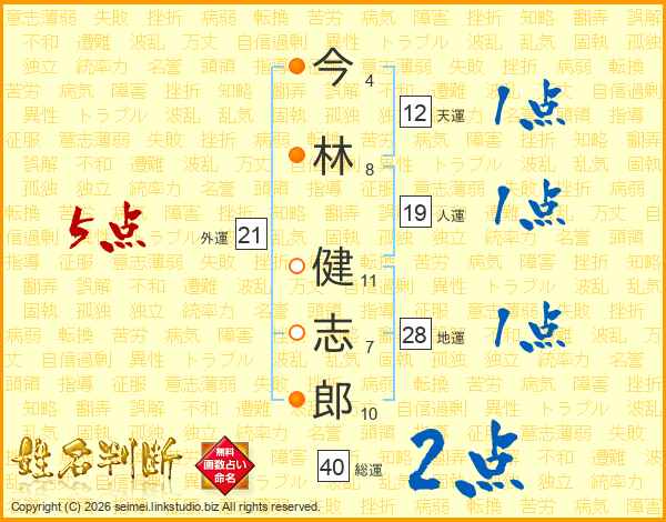 今(4画)林(8画) 健(11画)志(7画)郎(10画)