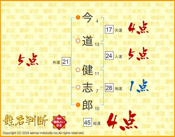 今(4画)道(13画) 健(11画)志(7画)郎(10画)