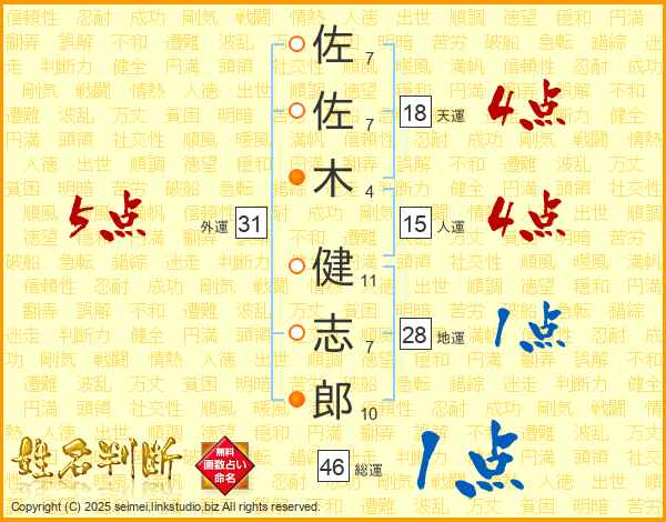 佐(7画)佐(7画)木(4画) 健(11画)志(7画)郎(10画)