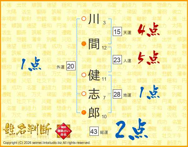 川(3画)間(12画) 健(11画)志(7画)郎(10画)