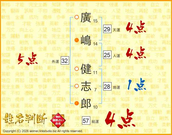 廣(15画)嶋(14画) 健(11画)志(7画)郎(10画)