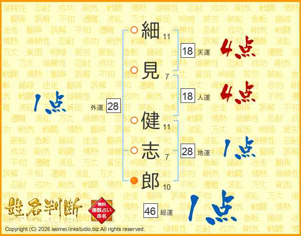 細(11画)見(7画) 健(11画)志(7画)郎(10画)