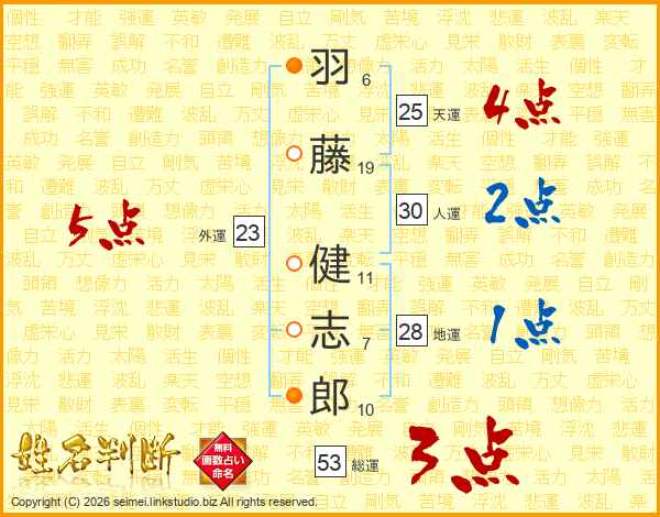 羽(6画)藤(19画) 健(11画)志(7画)郎(10画)