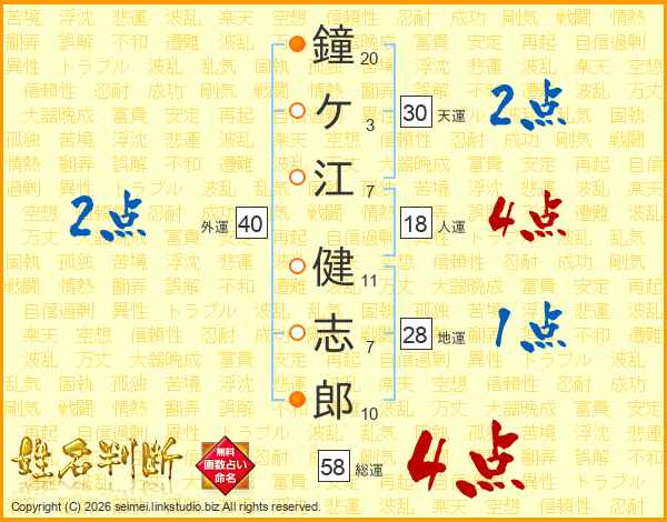 鐘(20画)ケ(3画)江(7画) 健(11画)志(7画)郎(10画)