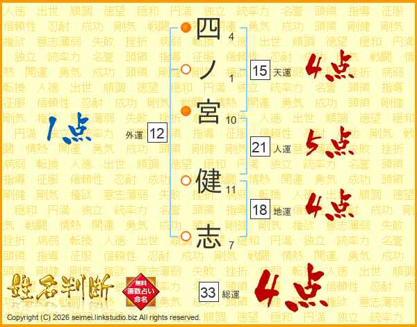 四ノ宮健志さんの総運は33画の4点!