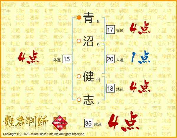 青(8画)沼(9画) 健(11画)志(7画)