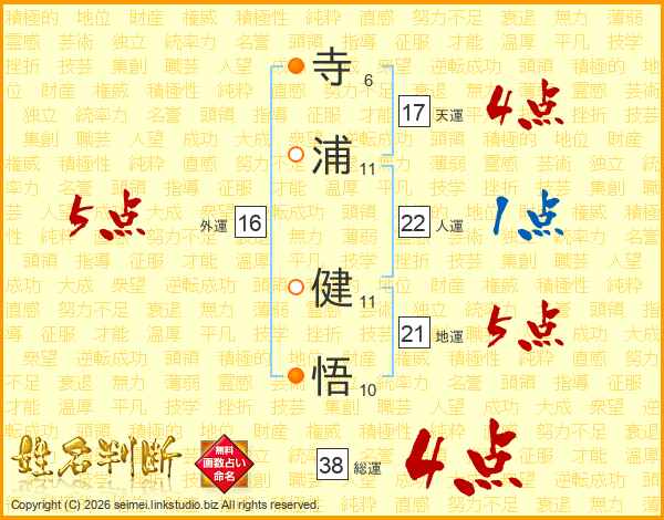 寺(6画)浦(11画) 健(11画)悟(10画)