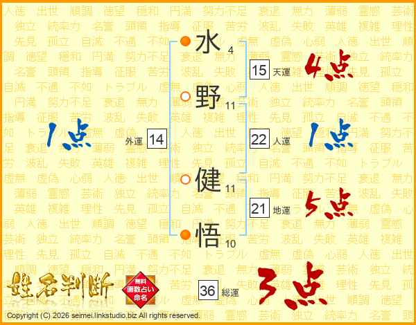 水(4画)野(11画) 健(11画)悟(10画)