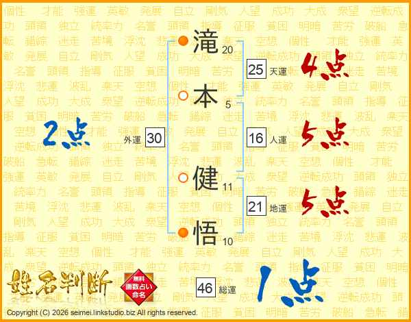 あなたの人生を表す1番重要な運勢です。生涯を通じて影響する総合運となり、主に50歳以降の晩年期に影響を及ぼします。苗字と名前の合計画数。