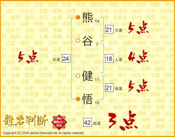 熊(14画)谷(7画) 健(11画)悟(10画)