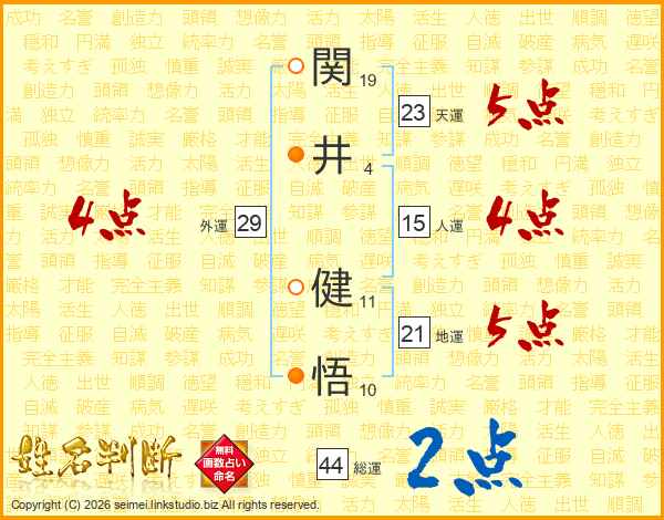 あなたの人生を表す1番重要な運勢です。生涯を通じて影響する総合運となり、主に50歳以降の晩年期に影響を及ぼします。苗字と名前の合計画数。