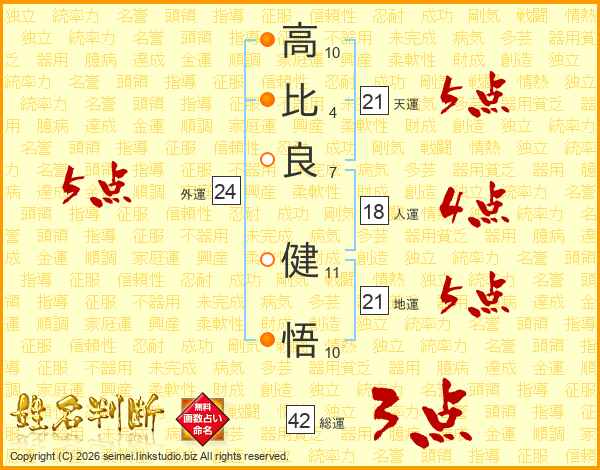 高(10画)比(4画)良(7画) 健(11画)悟(10画)