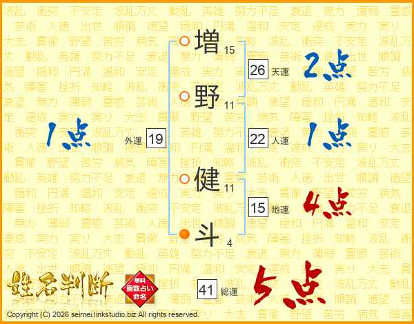 増(15画)野(11画) 健(11画)斗(4画)