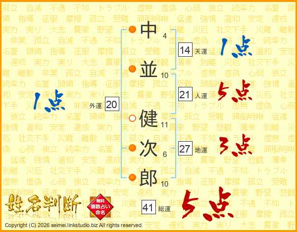 中(4画)並(10画) 健(11画)次(6画)郎(10画)