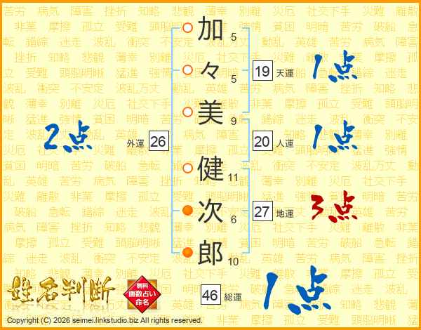 加(5画)々(5画)美(9画) 健(11画)次(6画)郎(10画)