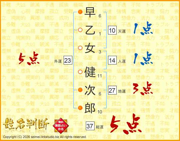 早(6画)乙(1画)女(3画) 健(11画)次(6画)郎(10画)