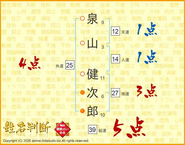 泉(9画)山(3画) 健(11画)次(6画)郎(10画)