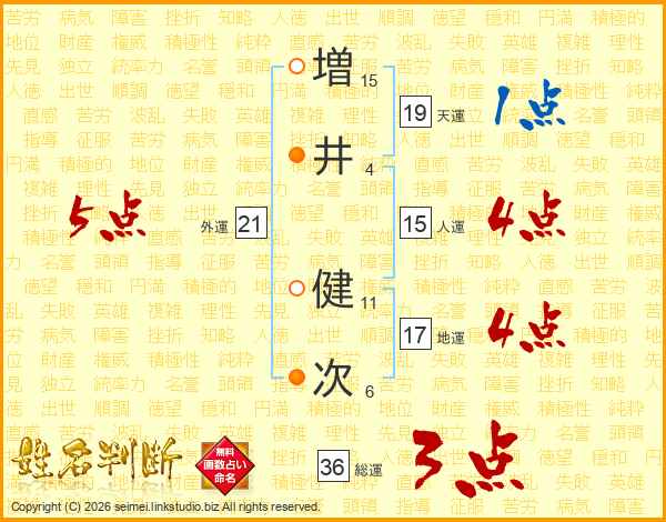 あなたの人生を表す1番重要な運勢です。生涯を通じて影響する総合運となり、主に50歳以降の晩年期に影響を及ぼします。苗字と名前の合計画数。