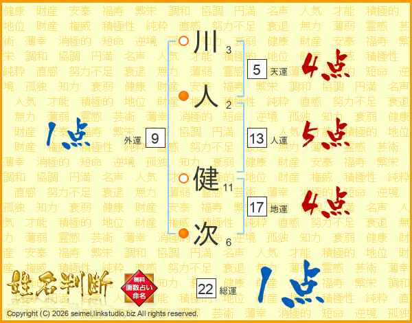 生活面を象徴する運勢です。外部から受ける影響力を表し、結婚運、家庭運や職場、環境への順応性を表します。総運から人運を引いた画数。姓や名が1文字の場合を除く。