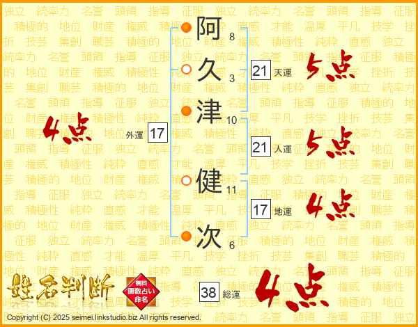 阿(8画)久(3画)津(10画) 健(11画)次(6画)
