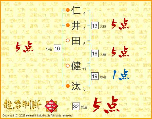 仁(4画)井(4画)田(5画) 健(11画)汰(8画)