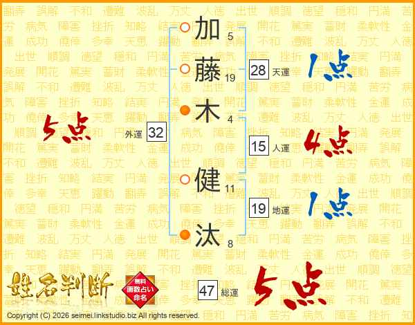加(5画)藤(19画)木(4画) 健(11画)汰(8画)