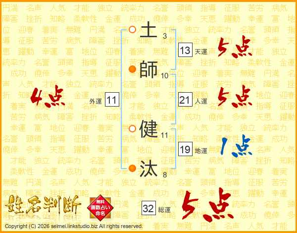 生活面を象徴する運勢です。外部から受ける影響力を表し、結婚運、家庭運や職場、環境への順応性を表します。総運から人運を引いた画数。姓や名が1文字の場合を除く。