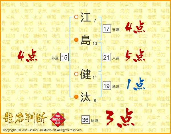 江(7画)島(10画) 健(11画)汰(8画)
