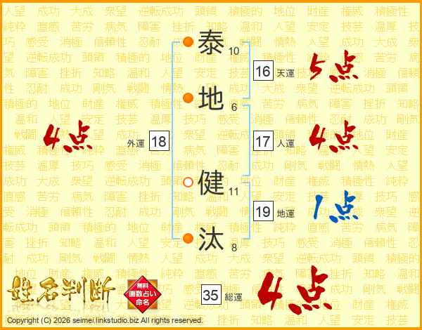 生活面を象徴する運勢です。外部から受ける影響力を表し、結婚運、家庭運や職場、環境への順応性を表します。総運から人運を引いた画数。姓や名が1文字の場合を除く。