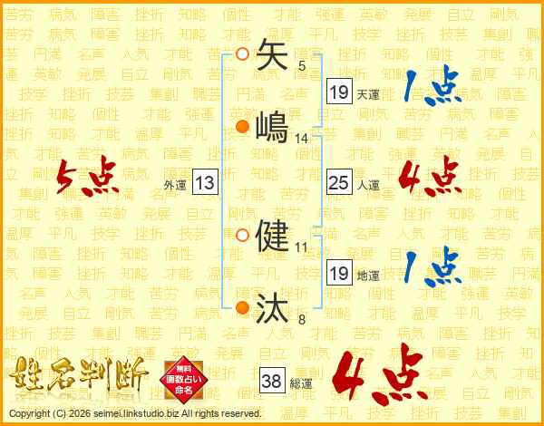 矢嶋健汰さんの総運は38画の4点!