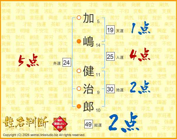 加(5画)嶋(14画) 健(11画)治(9画)郎(10画)