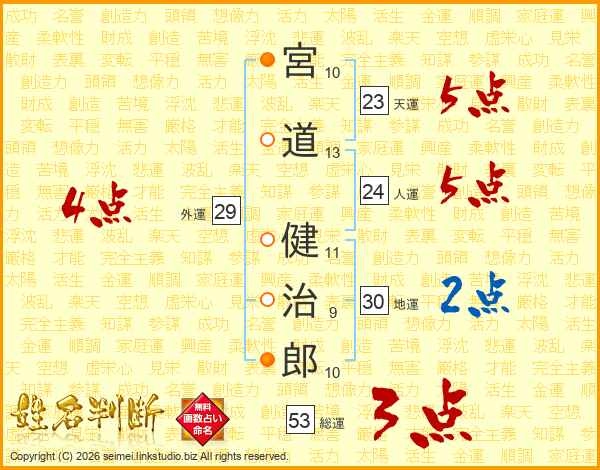 宮(10画)道(13画) 健(11画)治(9画)郎(10画)