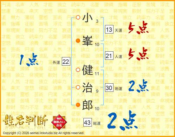 小(3画)峯(10画) 健(11画)治(9画)郎(10画)