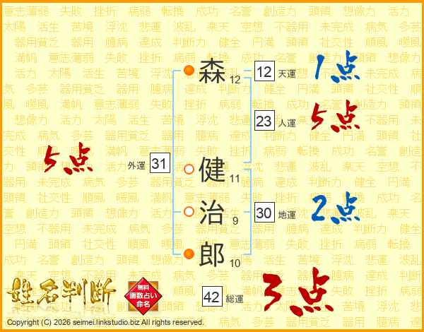 あなたの人生を表す1番重要な運勢です。生涯を通じて影響する総合運となり、主に50歳以降の晩年期に影響を及ぼします。苗字と名前の合計画数。